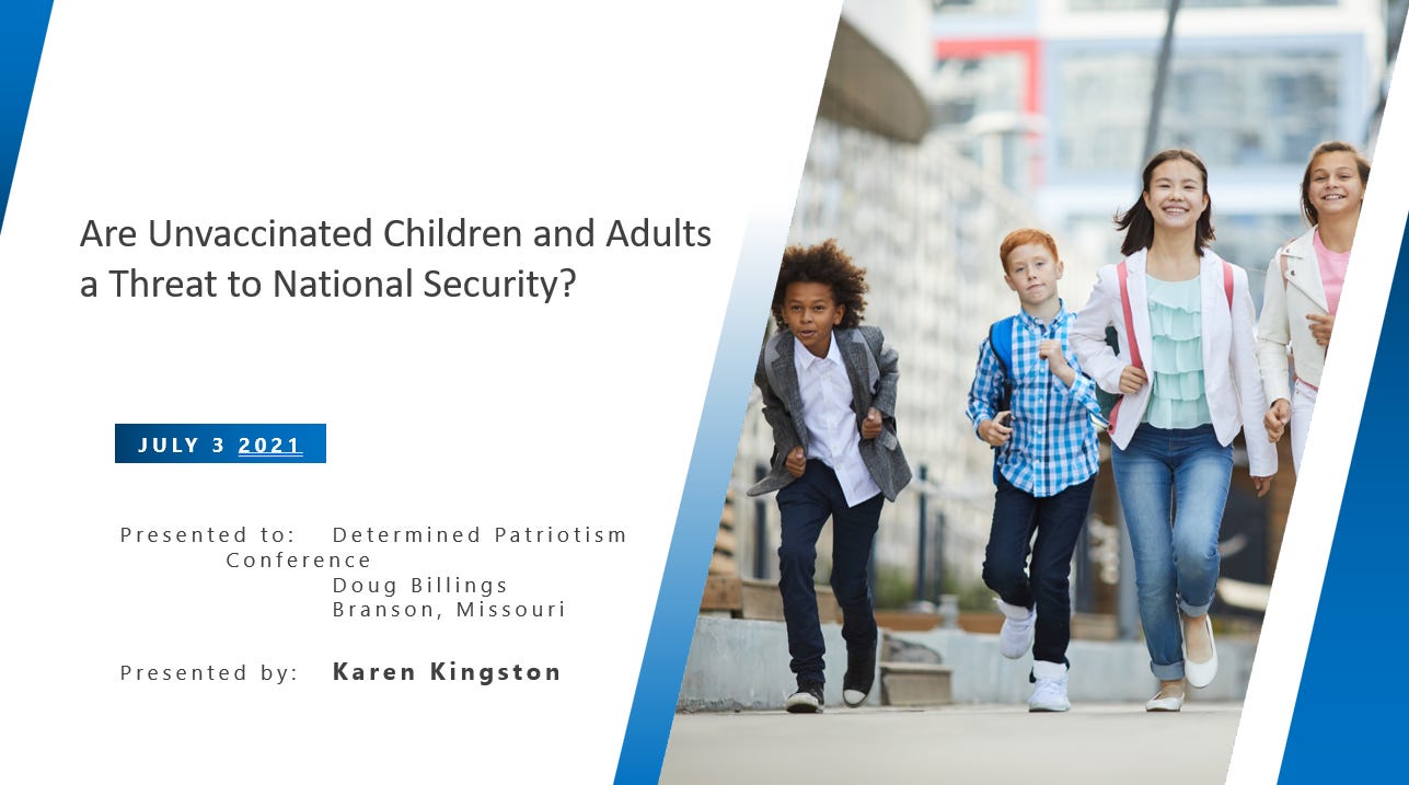 Le 3 juillet 2021, j'ai donné ma première présentation sur le COVID-19 et les injections d'ARNm, intitulée « Les enfants non vaccinés constituent-ils une menace pour la sécurité nationale ? » , lors de la tournée des Doug Billings , Determined Patriots à Branson, MO.
