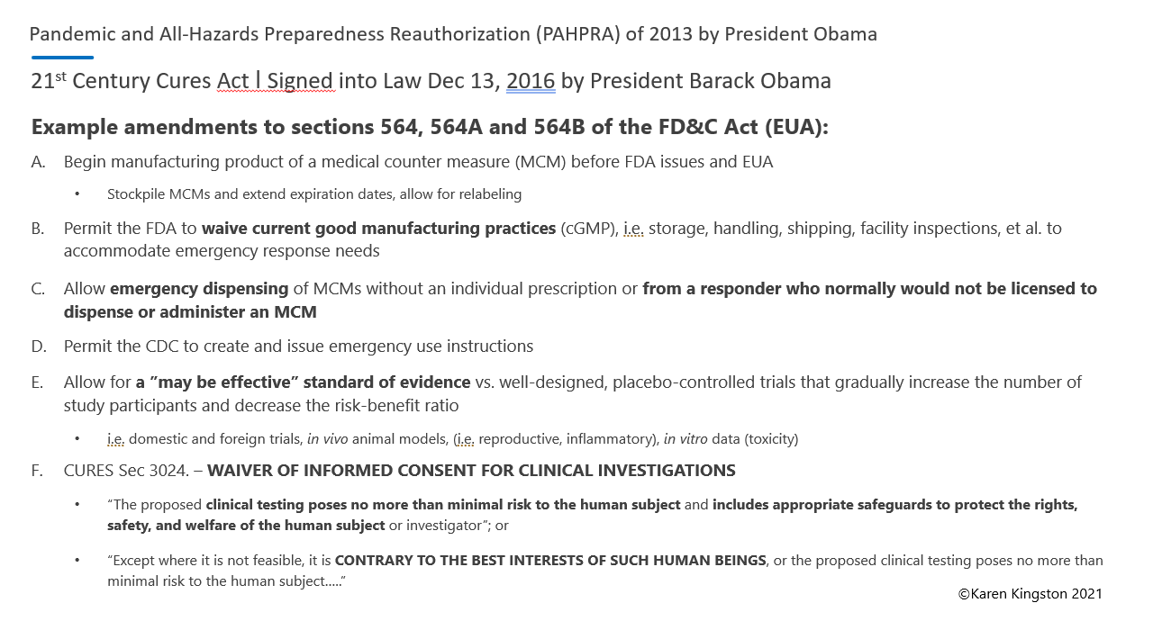 L’une des diapositives les plus poignantes (qui a suscité des halètements dans l’auditoire lorsque je l’ai présentée) était le résumé médical et juridique (réglementaire) des lois PREP, PAHRPA et CURES, et la manière dont ces réglementations renonçaient aux bonnes pratiques de fabrication, accordaient une immunité juridique, un recours juridique contre les fautes intentionnelles et une renonciation au consentement éclairé « s’il est contraire aux meilleurs intérêts de ces êtres humains ».